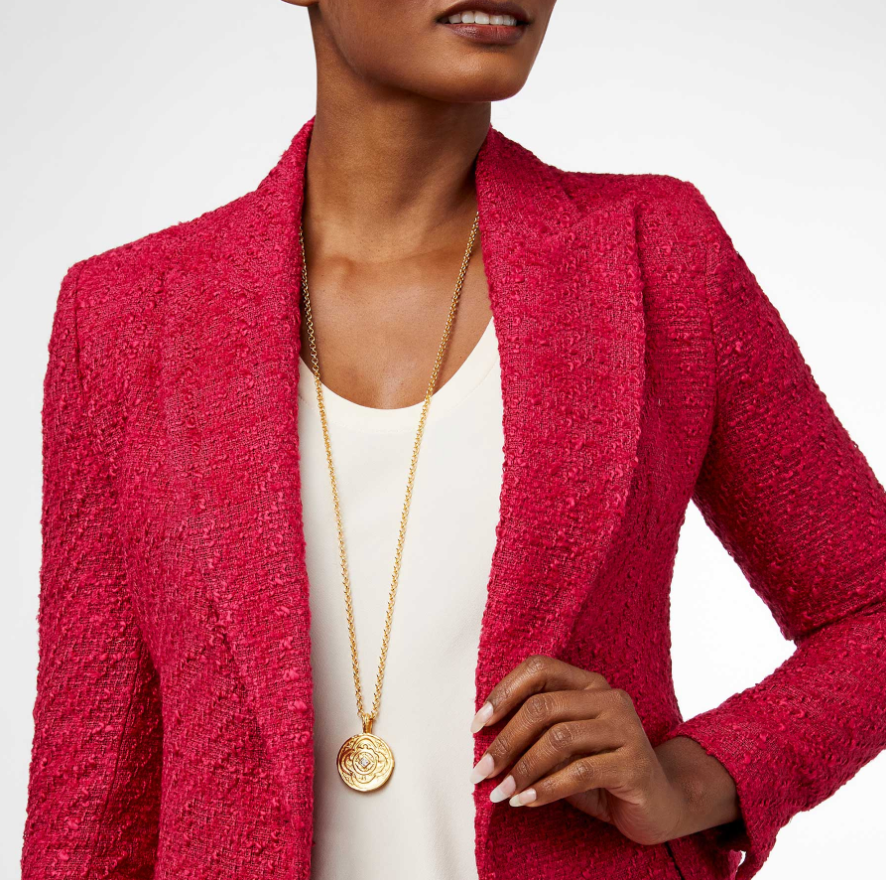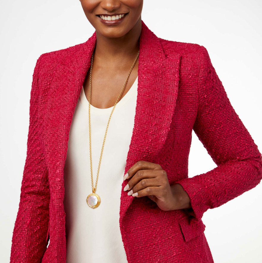 This pendant features smooth mother of pearl on one side and a quatrefoil coin on the reverse. The pendant hangs from a rolo chain that can be doubled up for a shorter length.