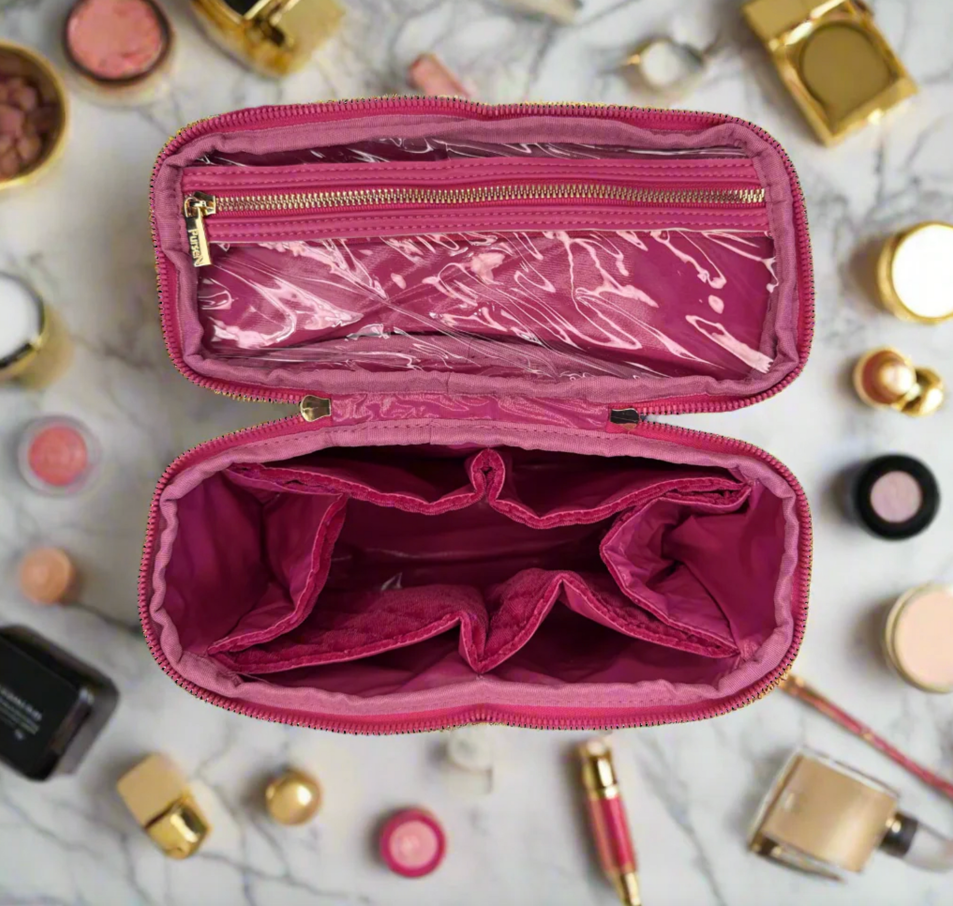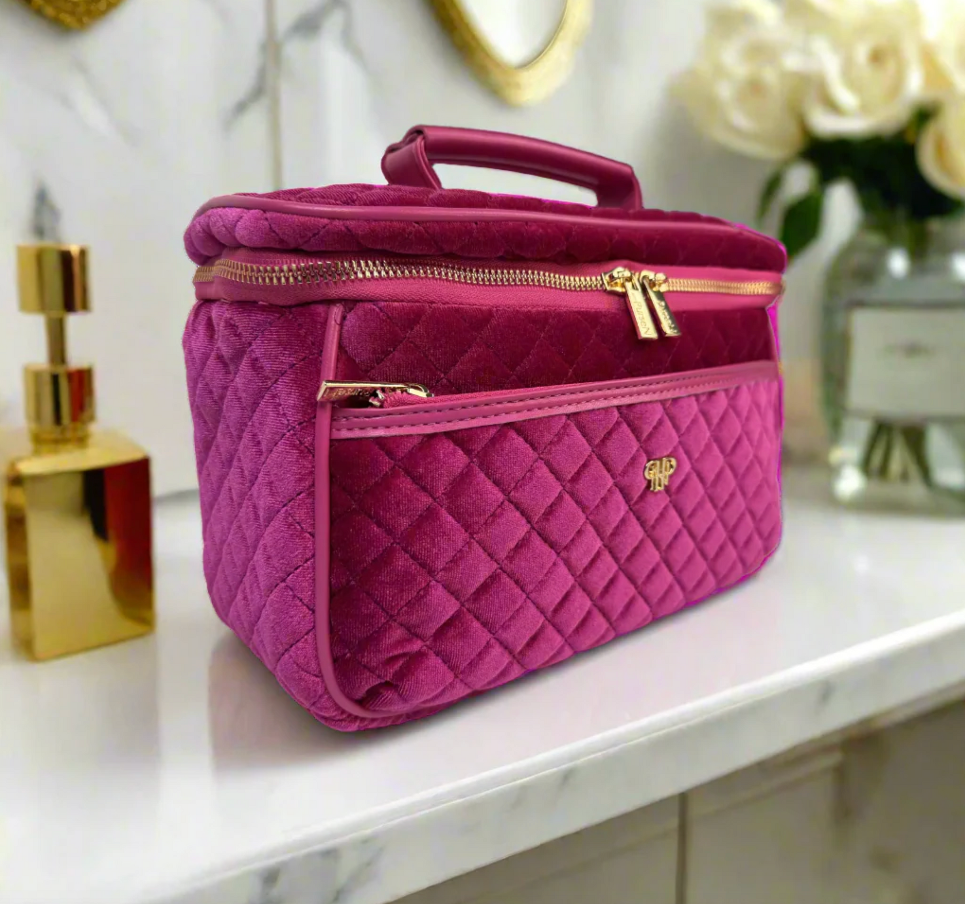 Add some chic and feminine color with our Fuchsia Velvet Train Case. This Classic Case is the perfect organizational tool for your beauty and toiletry essentials - perfect for lotions, makeup brushes, compacts, perfumes, and so much more.