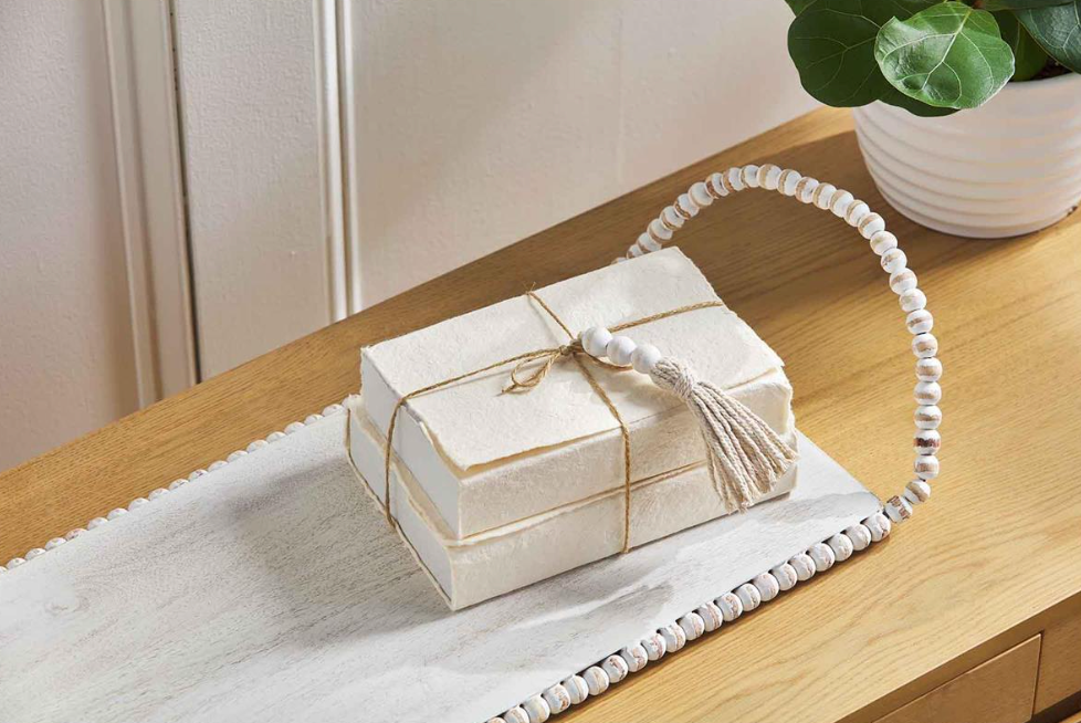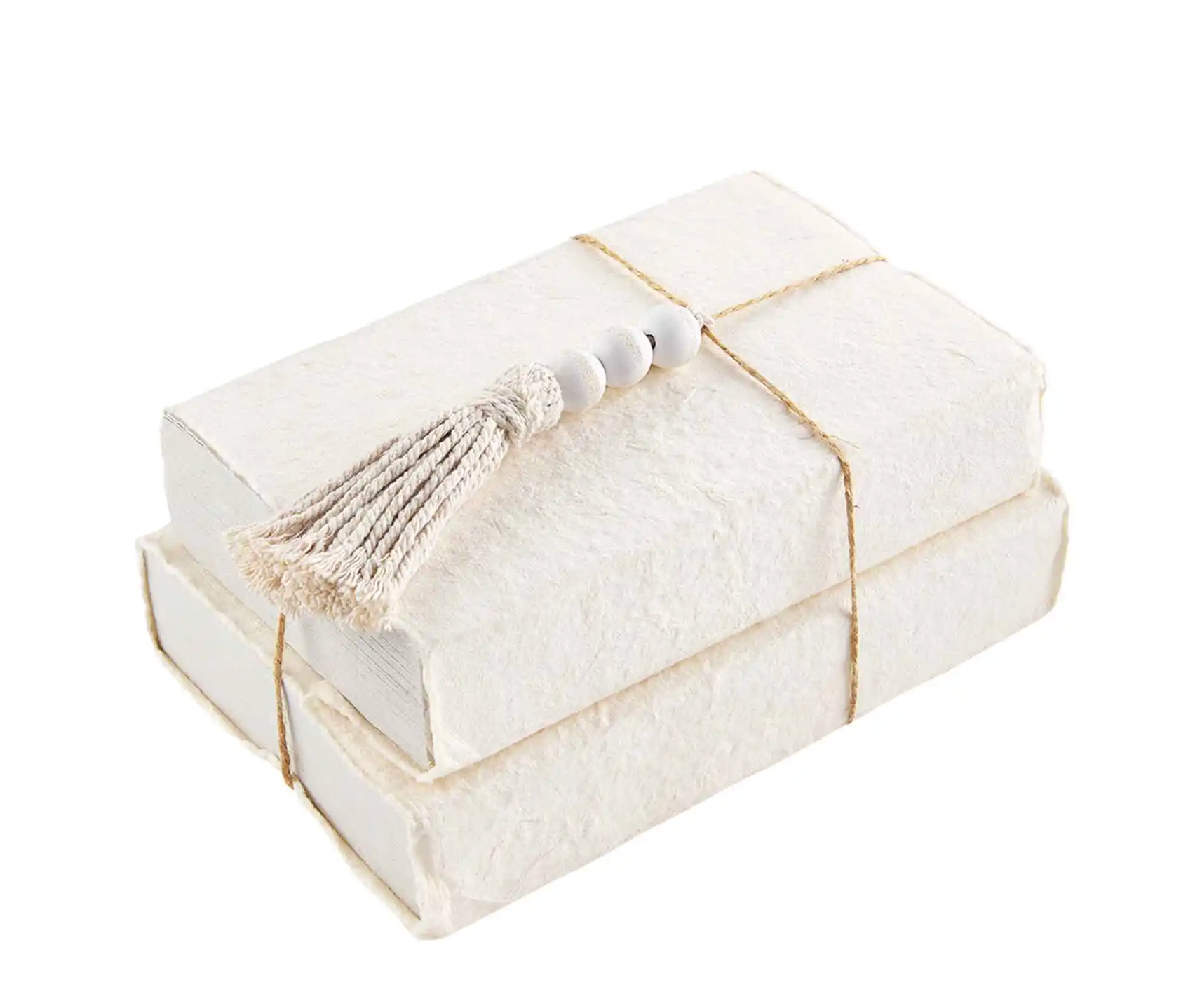 Add a personal touch to your entry table or shelves with our Book Stack Decor. The parchment paper wrapped decorative books are stacked and bound with twine. The books feature a beaded tassel accent. These books are super functional and can be added to many spaces in your home.