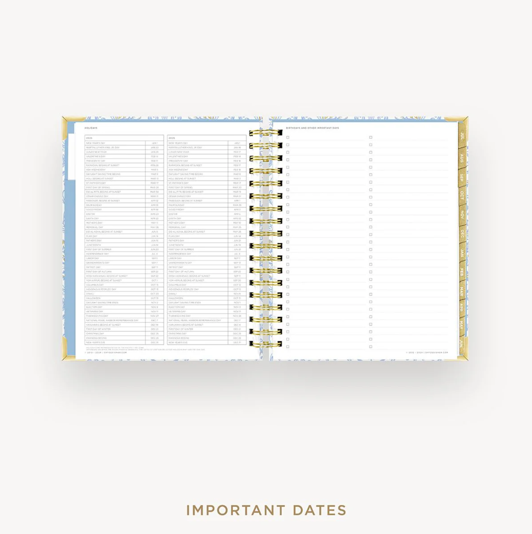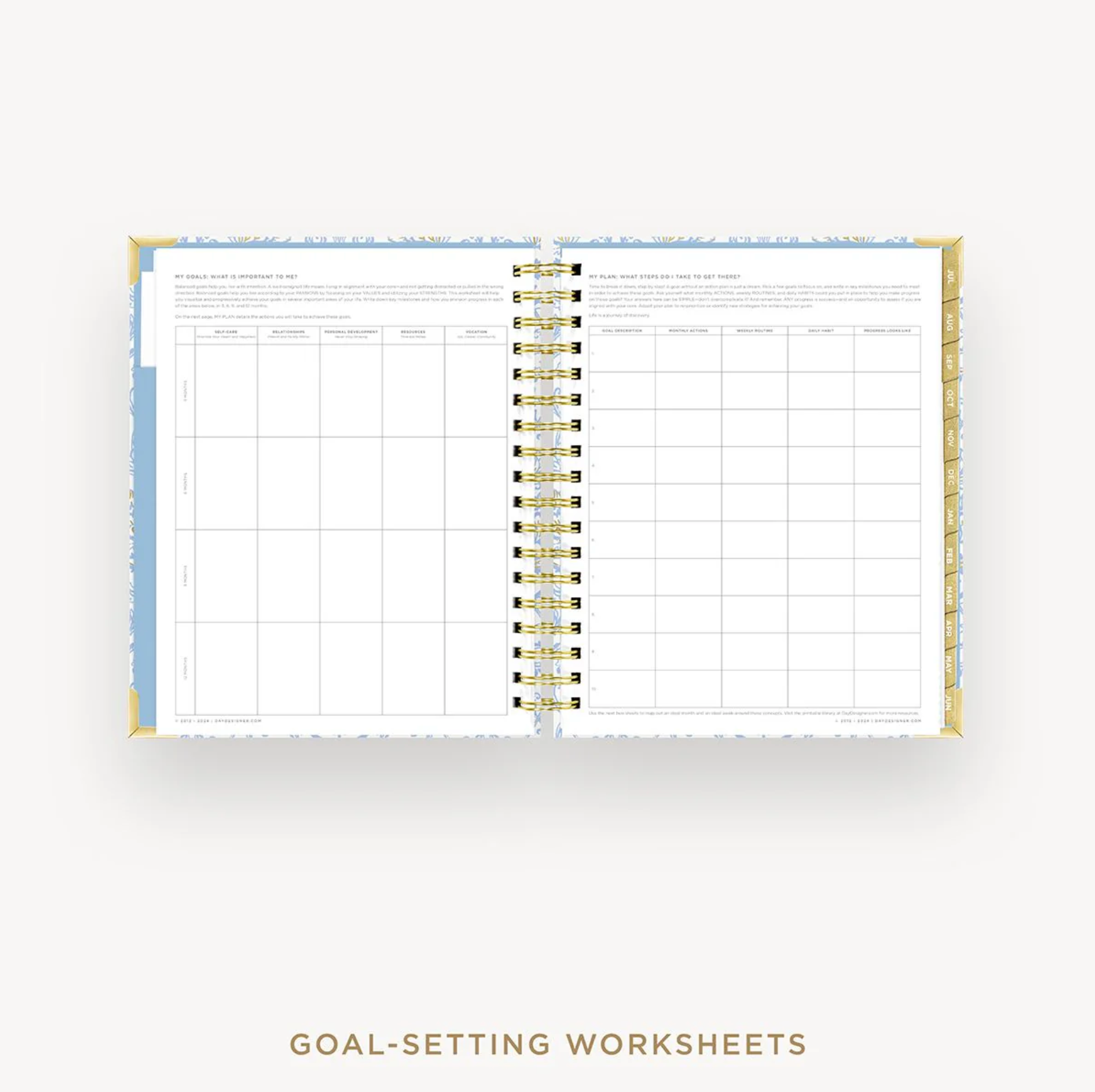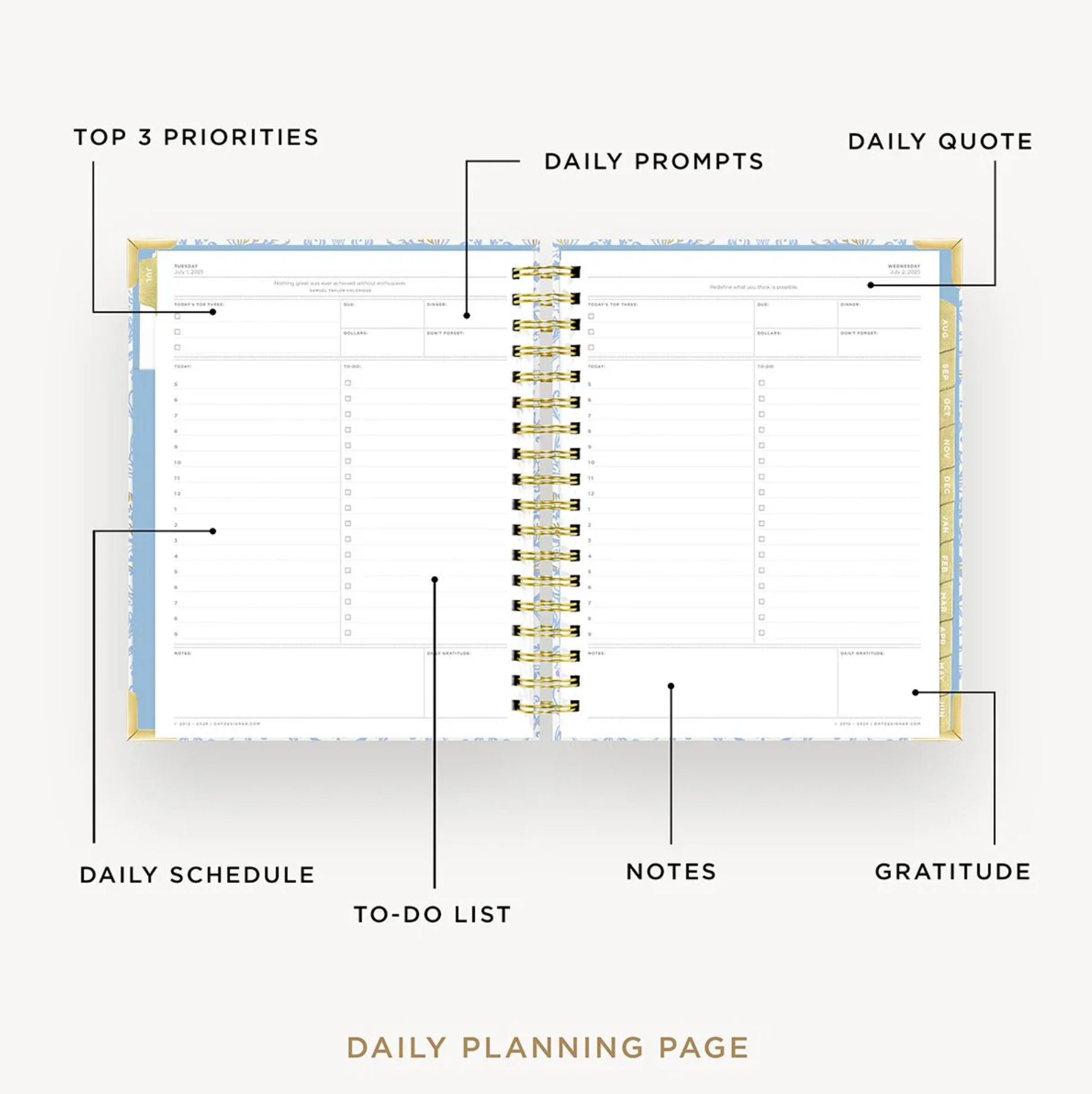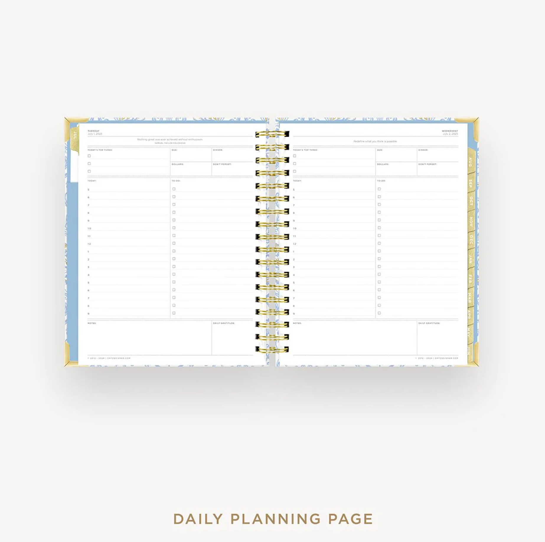 The complete daily planner for goal-setting, productivity and organization. Includes monthly calendar, daily schedule, to-do list and gratitude. An elegant block print pattern in a sophisticated large scale. Its soft coastal hues with touches of gold foil enhance your light and airy aesthetic.