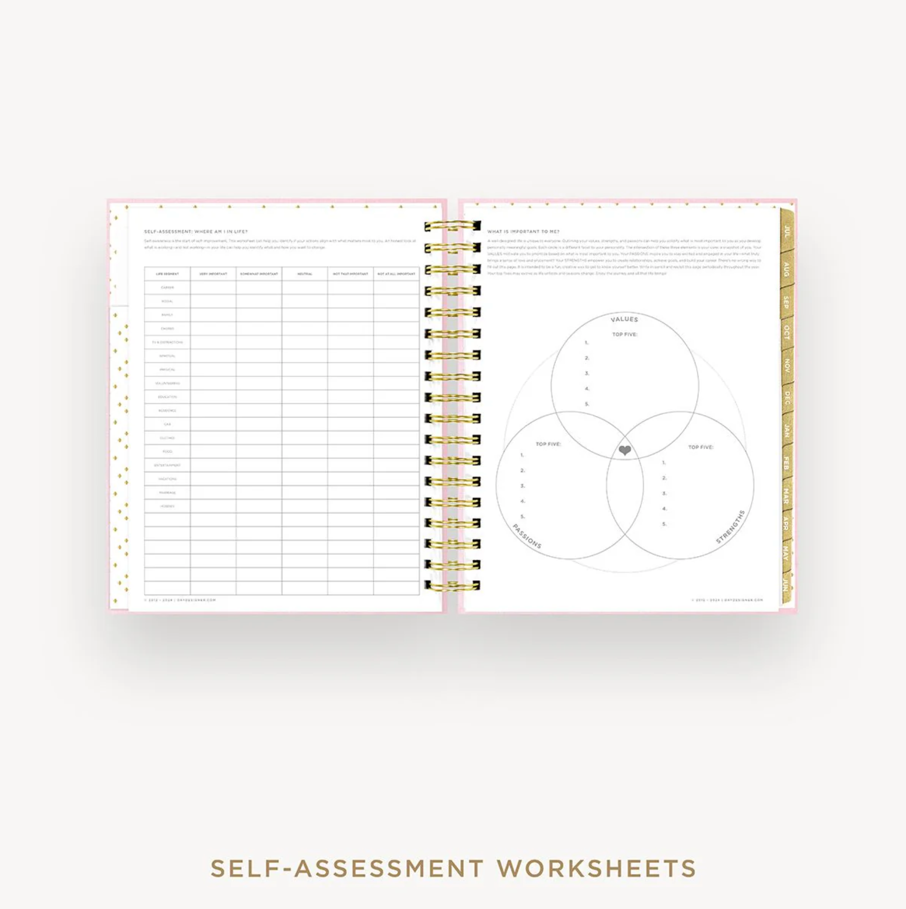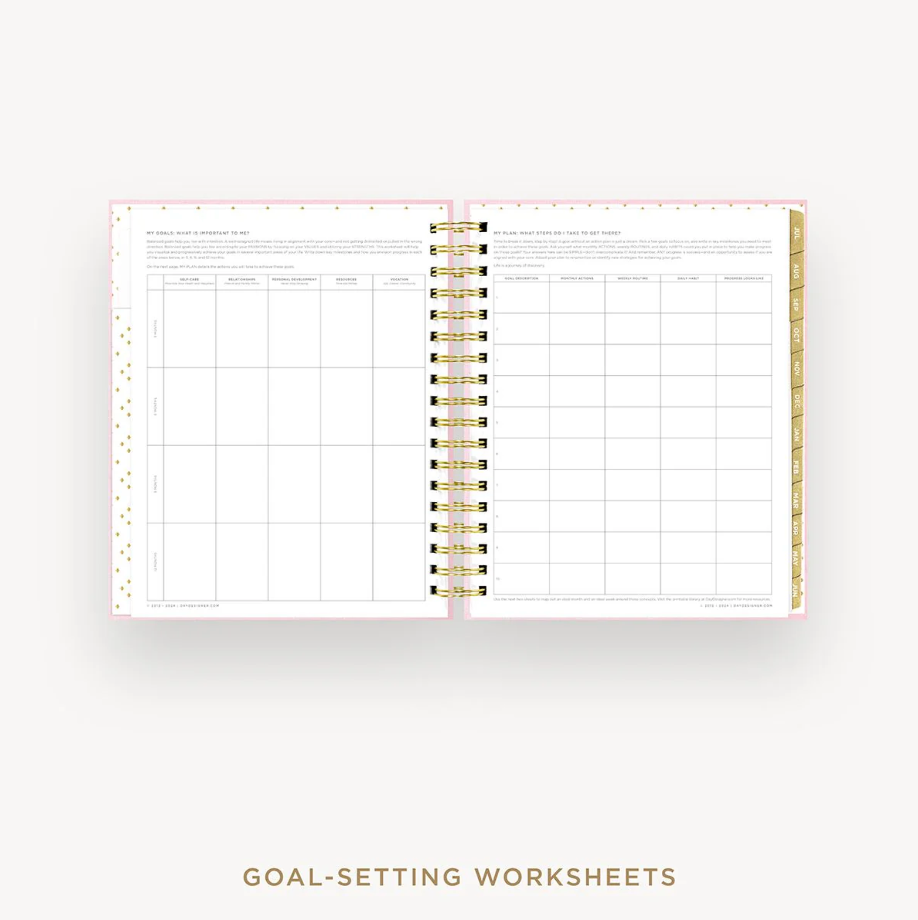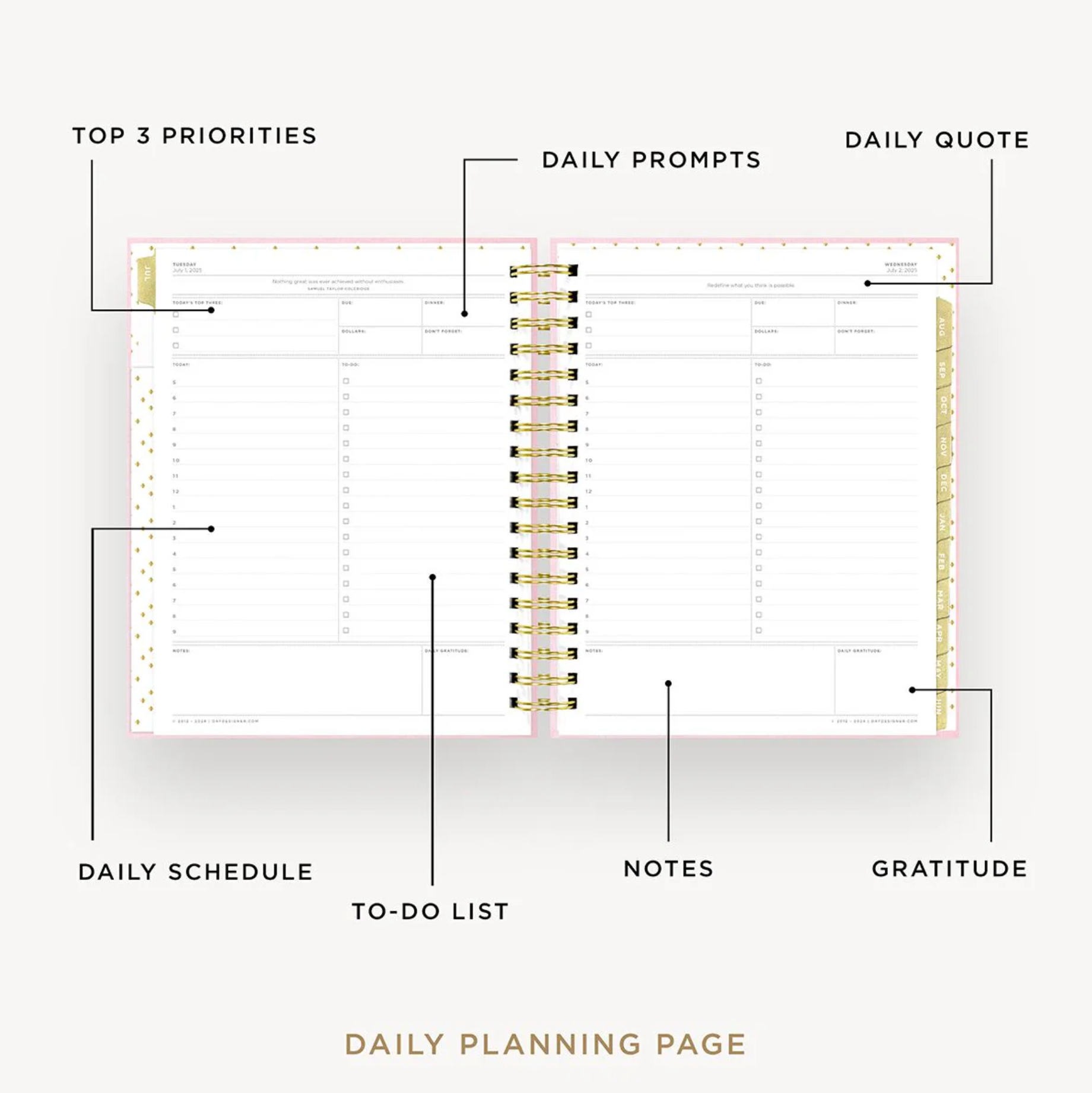 The complete daily planner for goal-setting, productivity and organization. Includes goal-setting, monthly calendar, daily schedule and to-do list. Linen-finish fabric cover in a timeless, soft pink hue!