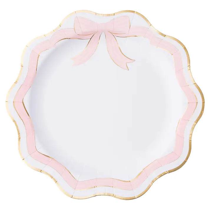 Elegant dinner plates featuring a baby pink bow with gold foil accents and scalloped edges. Perfect for bridal and baby showers, Mother’s Day, and Easter brunch, offering a chic, china-inspired look. > Includes 8 paper party plates > Size: 11" diameter (Large/Dinner Size) > Not microwave-safe > FSC-certified paper, eco-conscious materials > Inspired by the French, Designed in America by Bonjour Fête