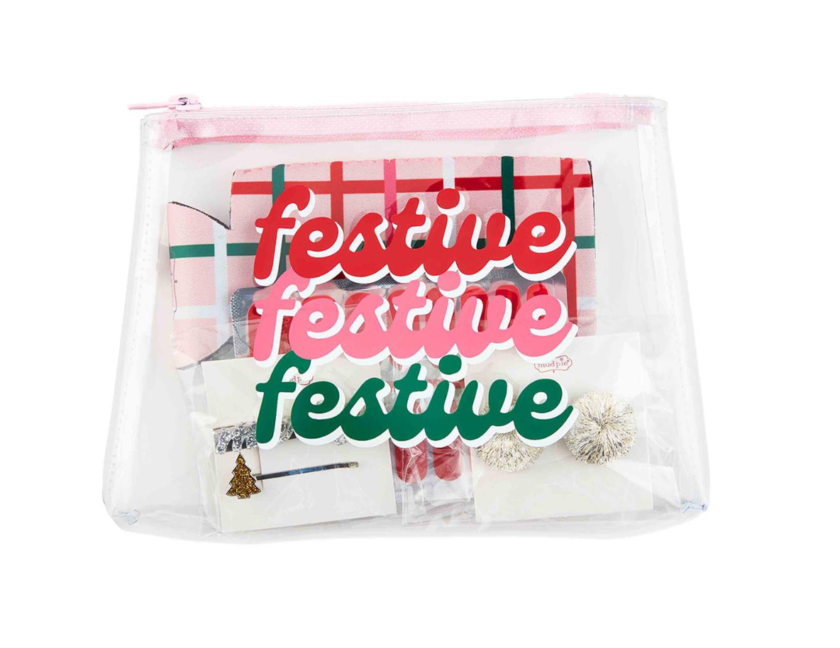 5-piece set: vinyl zipper case, neoprene can cooler, pair of tinsel pom earrings, set of two figural hair barrettes and sheet of festive nail decals.