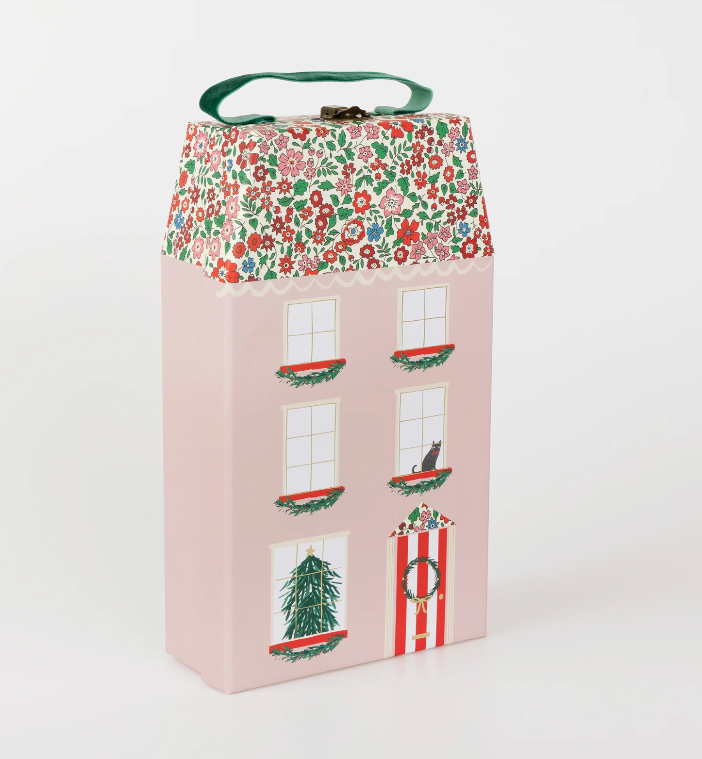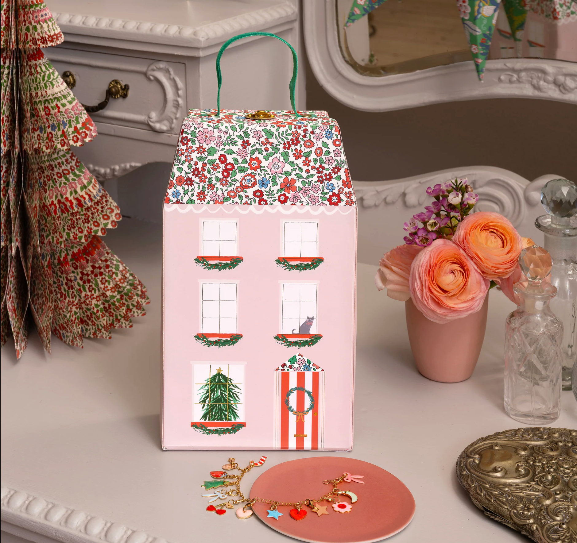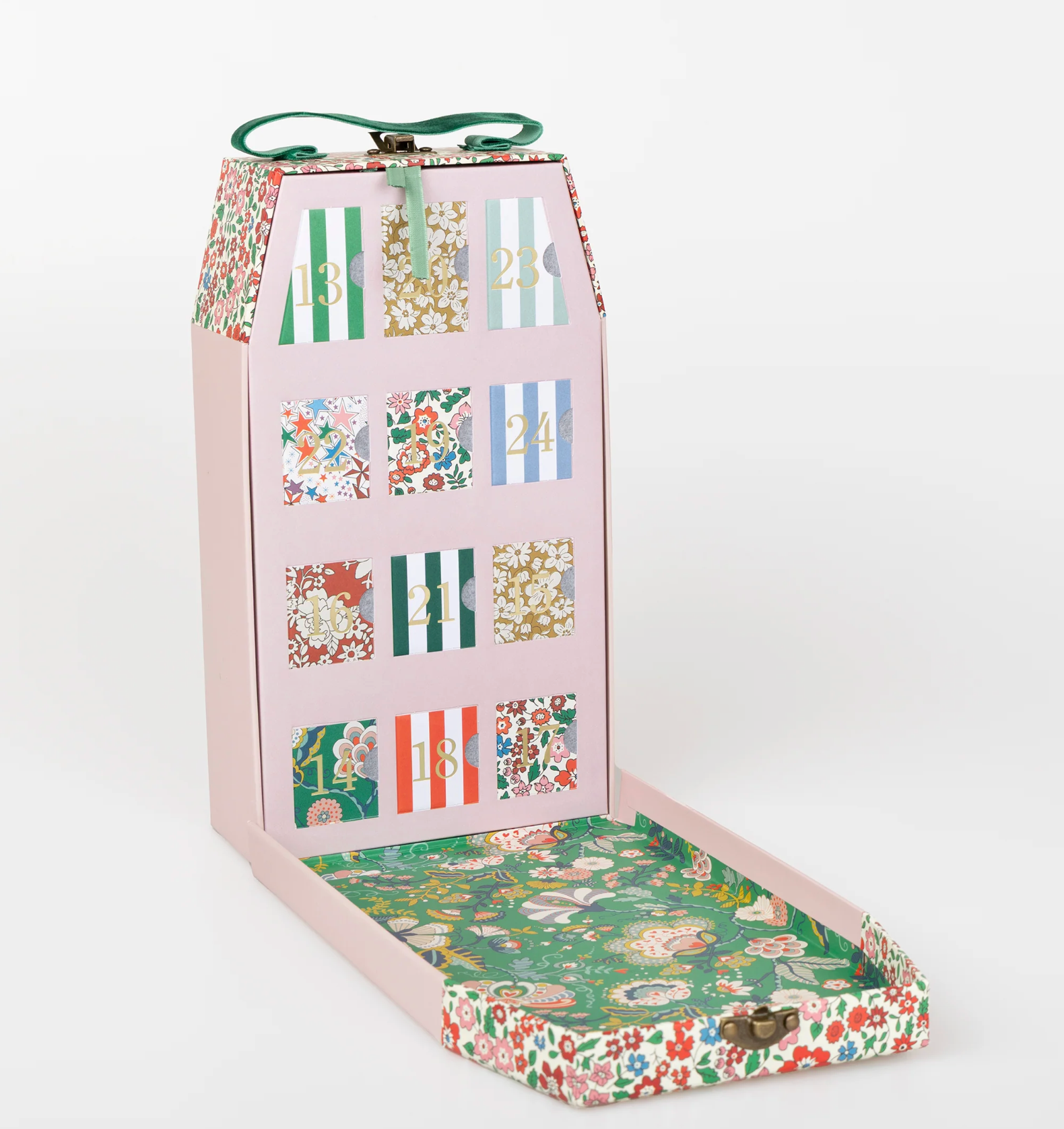 We've collaborated with Liberty to bring you the most elegant Christmas advent calendar, designed to decorate, accessorize and make the Christmas countdown extra special. This enchanting suitcase-style paper house features a joyful Liberty floral print roof, luxurious green velvet ribbon handle, burnished brass closure, and clever festive illustrations, perfect to display on a table or mantel for a stunning effect. Open to reveal numbered doors, with Liberty floral prints. Inside the first door is a gold tone chain bracelet, with the rest each containing a captivating charm to culminate in a stunning piece of jewelry to wear on Christmas day and beyond. Reuse the suitcase as a charming storage box for your most precious belongings. Driven by discovery, Liberty has been home to the artistic shopper since 1875. Famed for its directional design and celebration of craftsmanship, its prints are created in the heart of London by the Liberty design studio.
