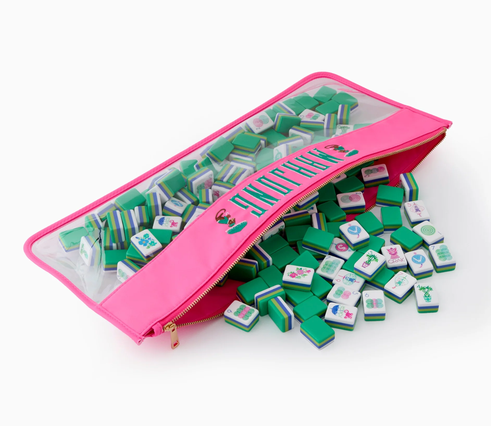 Get ready to mahj in style with the Pink Monkey Zippered Bag! In a bold neon bubblegum pink with vibrant rich teal embroidery, this playful bag is framed by two adorable matching monkeys, adding a fun, cheeky vibe to your game night. It’s as functional as it is fabulous, with a spacious interior, secure zipper closure, and a clear bottom section to show off your tiles in style. Perfect for those who love to make a statement while keeping their game essentials safe and sound!