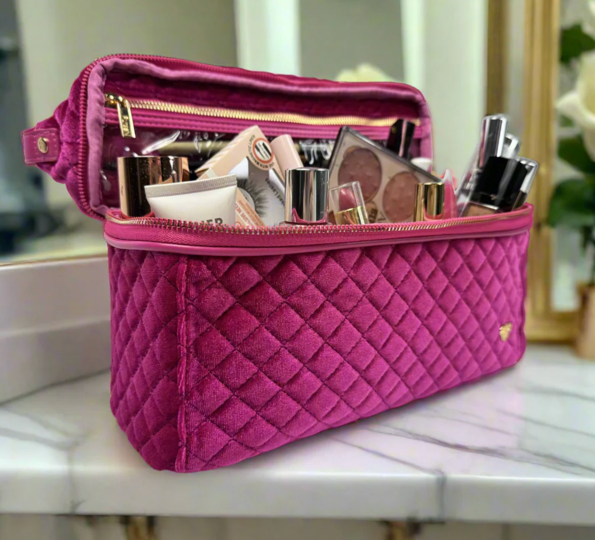 The Fuchsia Velvet Quilted Stylist Bag is designed for hot styling tools and keeping them separate from your other beauty products. The top compartment features a heat resistant liner so you don’t have to wait to put away your hot tools. The bottom compartment is ideal for larger and heavier items such as bottles, jars, hairbrushes and more. The two combine to make the ultimate toiletry case.