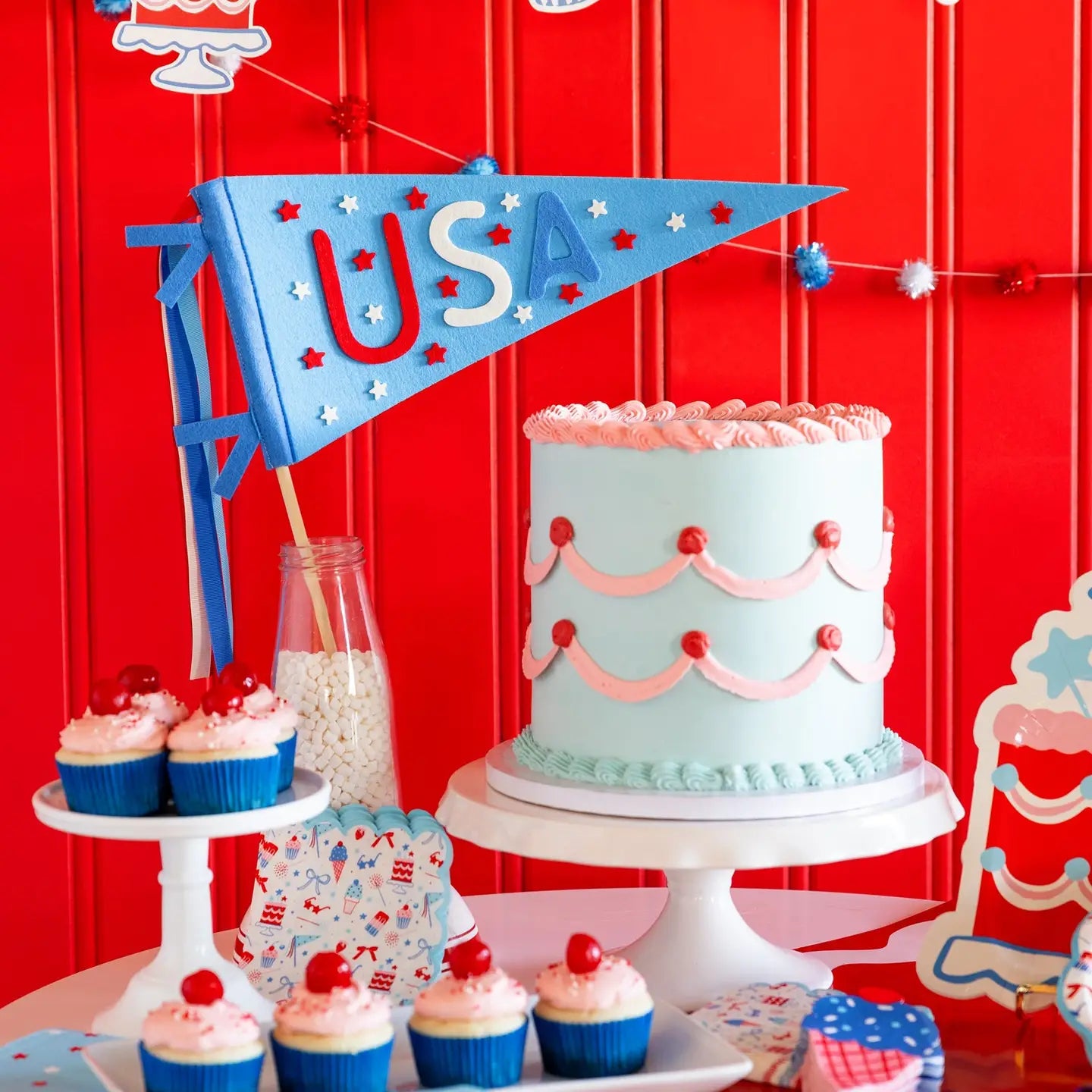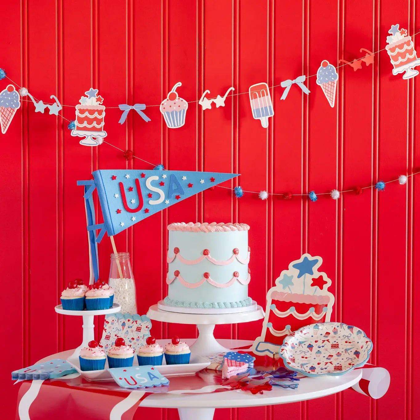 Celebrate in style with our Summertime Icon Banner Set! Featuring patriotic icons, summer treats, and playful pom poms, this banner will add a festive touch to any party or gathering. Get ready to have some fun in the sun with this must-have decoration! • Includes 2 paper banners • Patriotic icons, 6' long • Pom ppom banner, 6' long • Paper pieces are approximately 3" to 6" tall • Pom poms are 1"